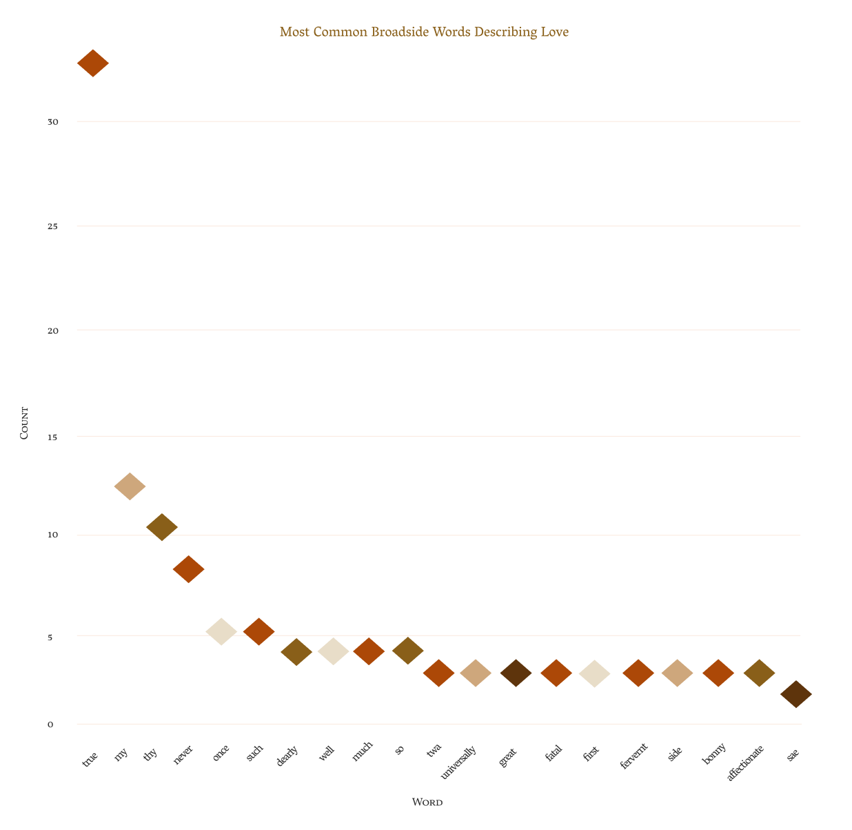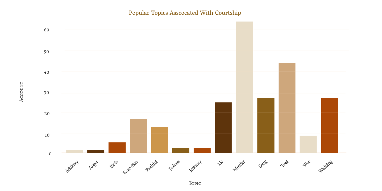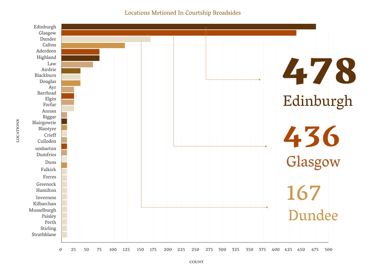 Courtship and love in the time period of the Scottish broadsides is an interesting topic to explore further. Courtship and love was written about in a variety of ways, including songs, such as romantic love letters; humour, such as silly lover letters; and crimes of passion, which were written about in the context of murder and trials. Below are some summary visualisations that show where in Scotland courtship was written about, what words were commonly used before love and the topics that were written about in broadsides about courtship.